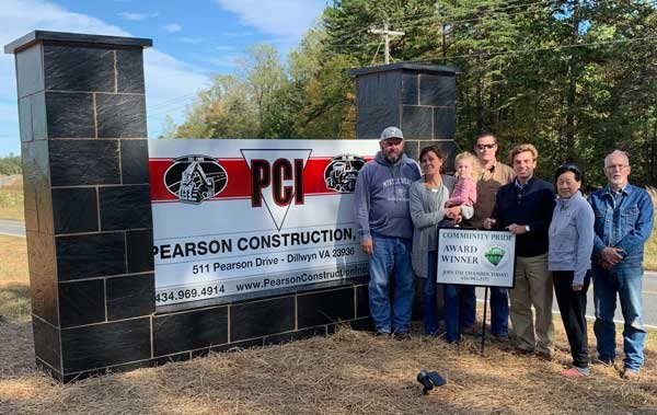 Pearson Construction Inc. was recognized in October 2019 by the Buckingham Chamber of Commerce for their contribution to the Buckingham County community. The family-based business employs local workers and has completed many projects all over the state. Pictured, from left: David Perkins, Lynn Perkins, Penelope Perkins, Chad Perkins, Thomas Jordan Miles, Barbara Wheeler and Eddie Slagle.